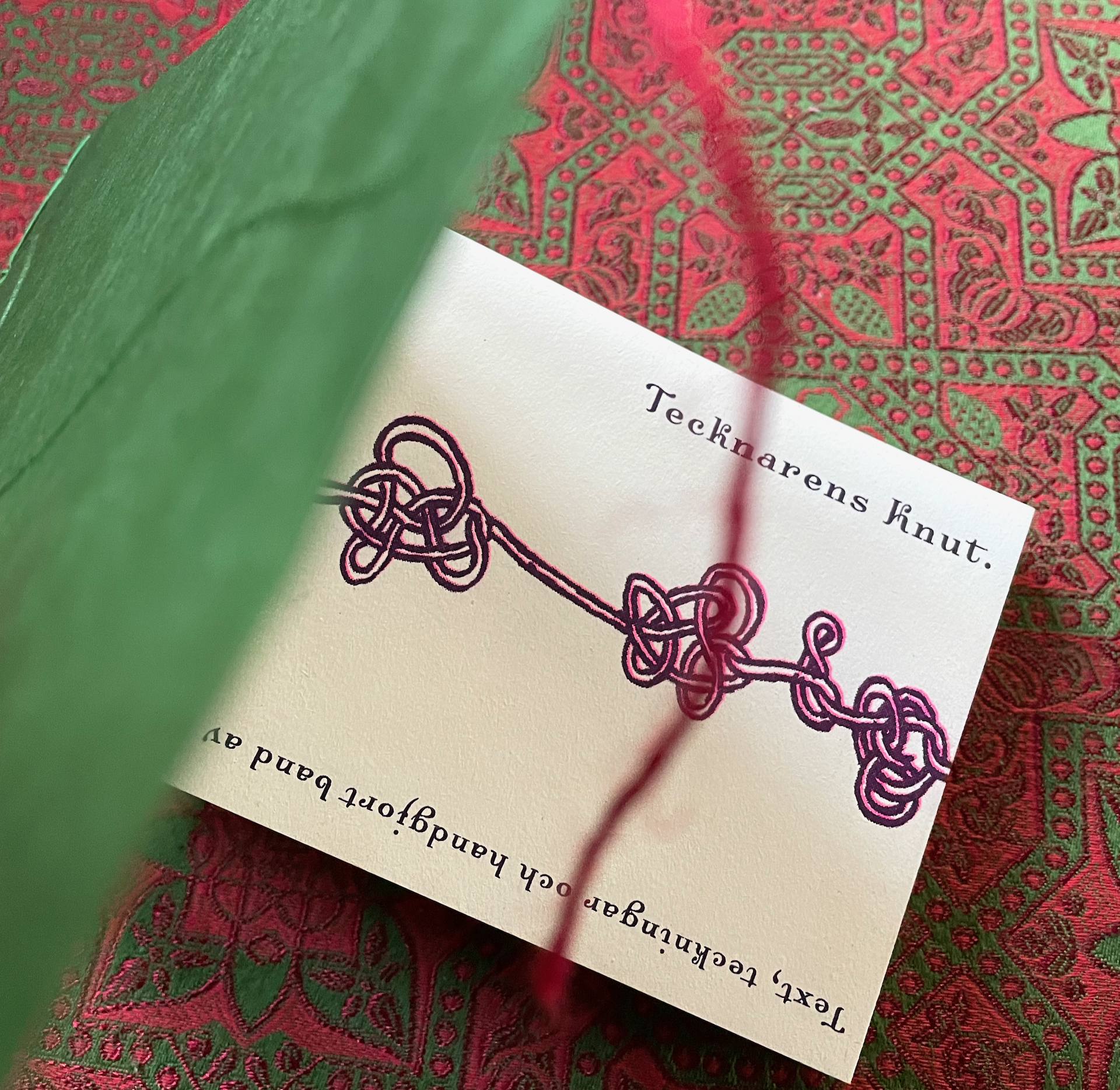 This booklet manifests a temporary obsession with drawing knots. Between the prints of a knot in different combinations of colour and design are five picture poetic instructions for how to liberate oneself from mental knots. Swedish text.
