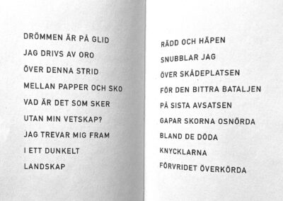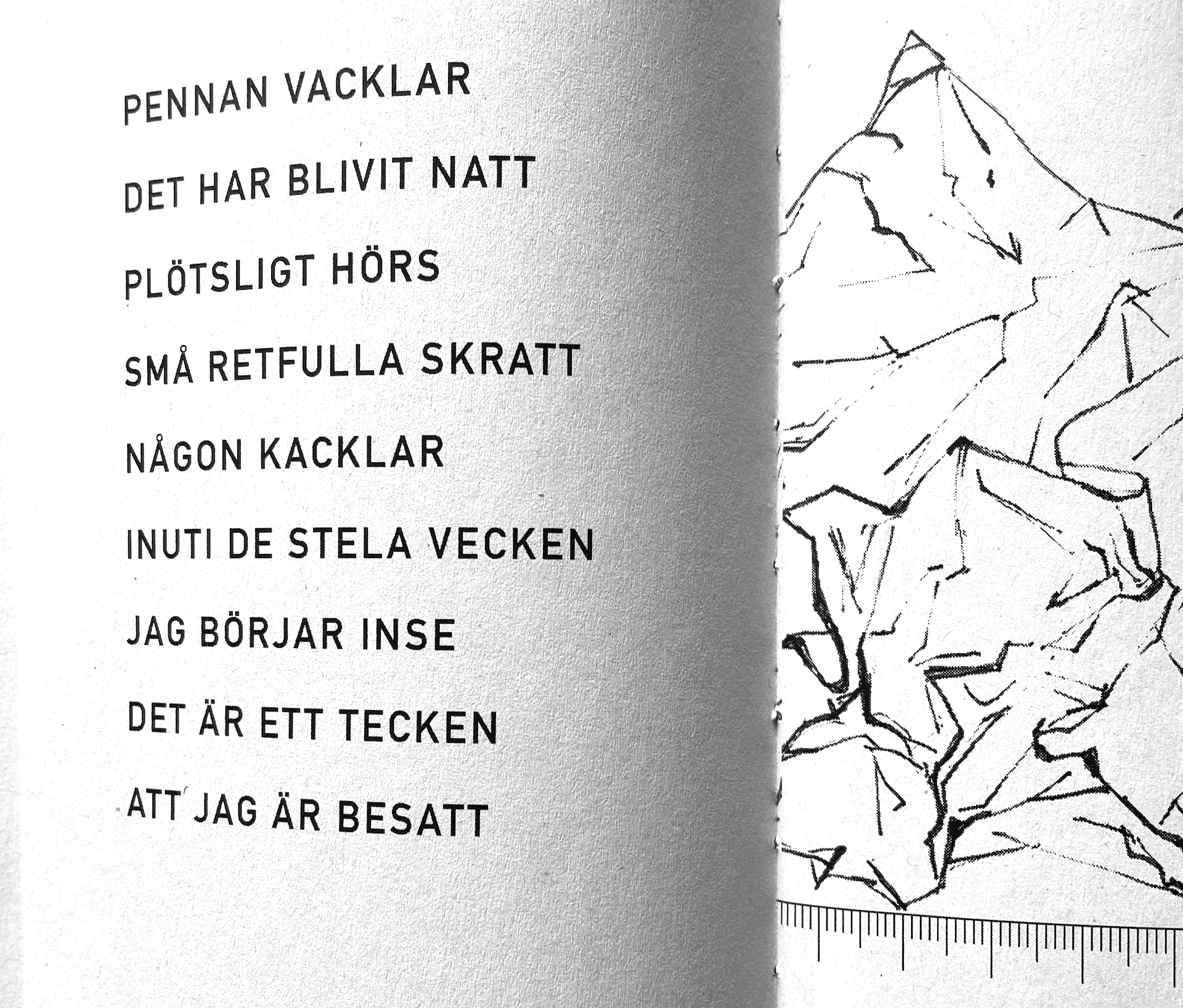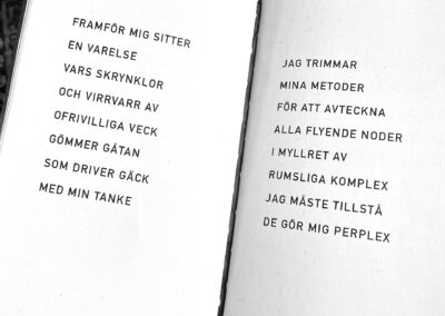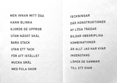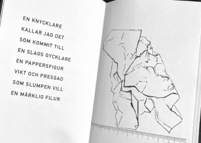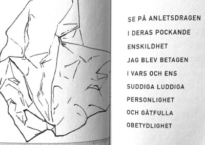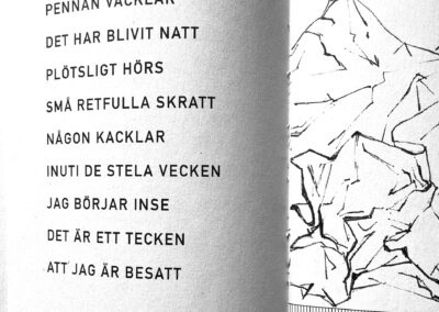 This is the story as told in 38 rhyming verses: I squeezed pieces of paper into hard balls and let them fall on my desk. Each one glared at me with a stubborn lack of meaning. I wanted to penetrate their insignificant features by drawing their portraits. It became a hypnotizing embroidery. The paper balls turned into mischievous creatures and one night while I was sleeping they started a fight with the empty shoes at the bottom of the stairs. They were horribly defeated and and flattened. I dropped them into the recycle bin.